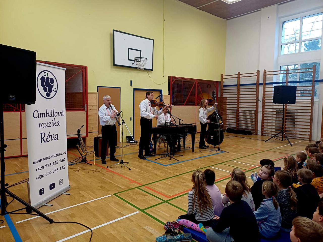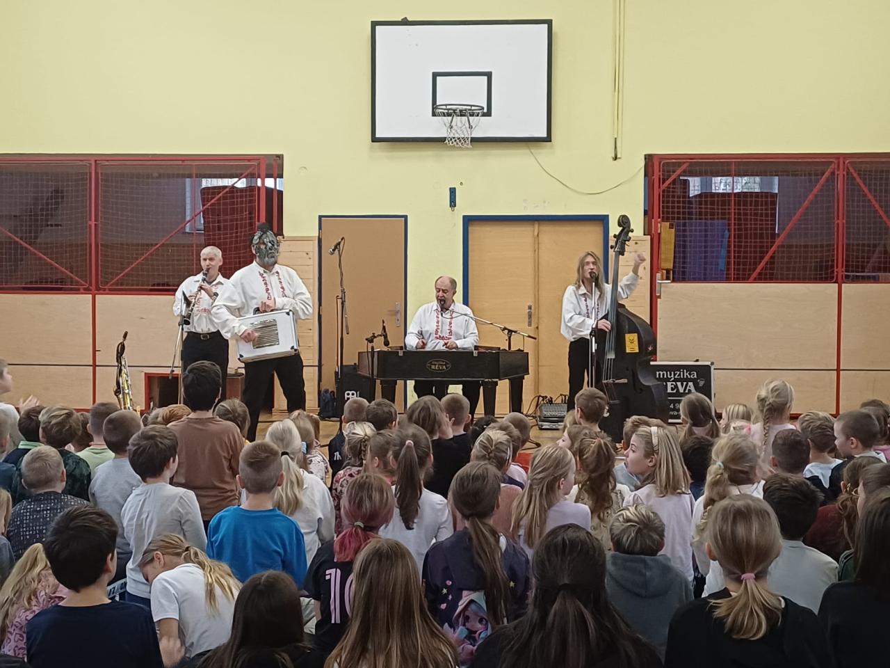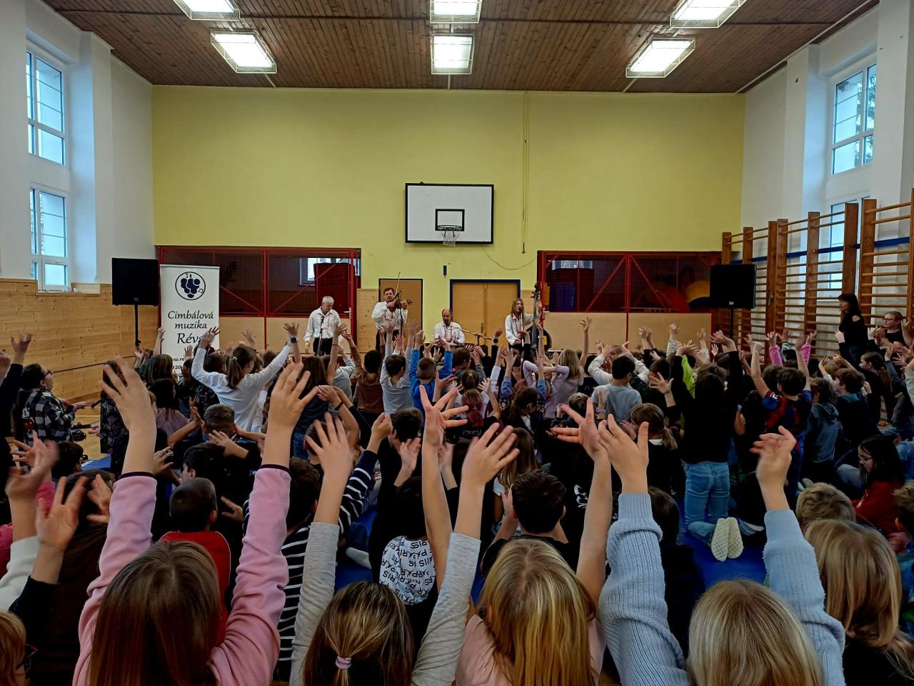 Ve středu dopoledne se tělocvična naší školy rozezněla kouzelnými tóny cimbálu, houslí a dalších lidových nástrojů. Cimbálová muzika Réva, která k nám zavítala za Zlína, připravila žákům i učitelům jedinečný hudební zážitek. Od prvních tónů bylo jasné, že se jedná o skutečně výjimečné energické vystoupení, živé a zároveň citlivé k tradicím naší lidové kultury. Děti si užily nejen tradiční lidové písně, ale také moderní skladby, které kapela zahrála v originálním cimbálovém aranžmá.