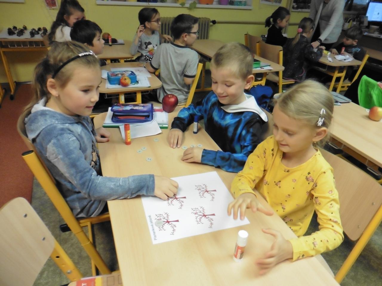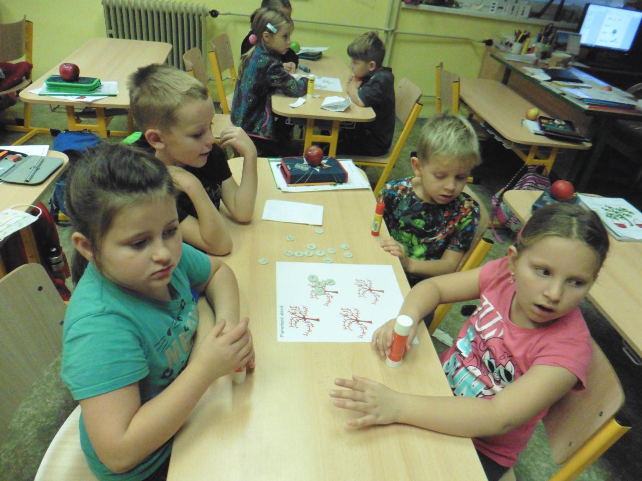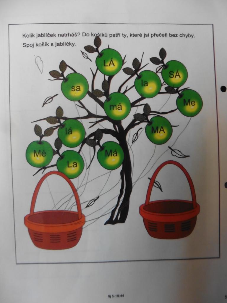 Četli, počítali, vyhledávali tvary písmen na písmenkové jabloně, spolupracovali při skládání obrázků, tvořili a zavařovali, ochutnávali :-), poslouchali pohádku, zpívali s doprovodným pohybem, hodnotili.