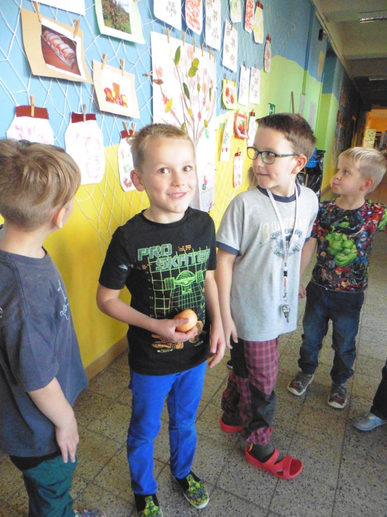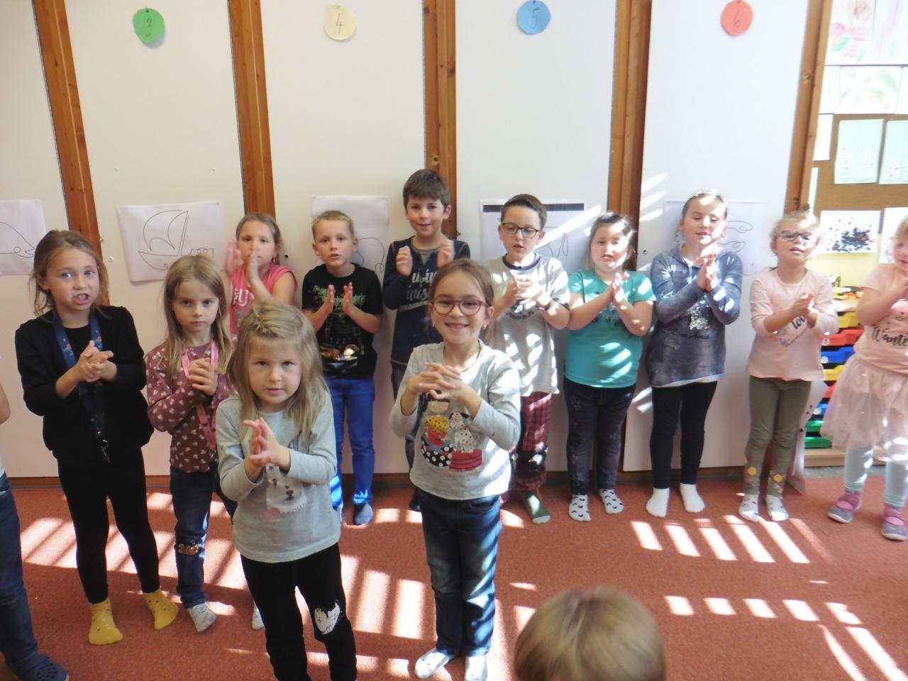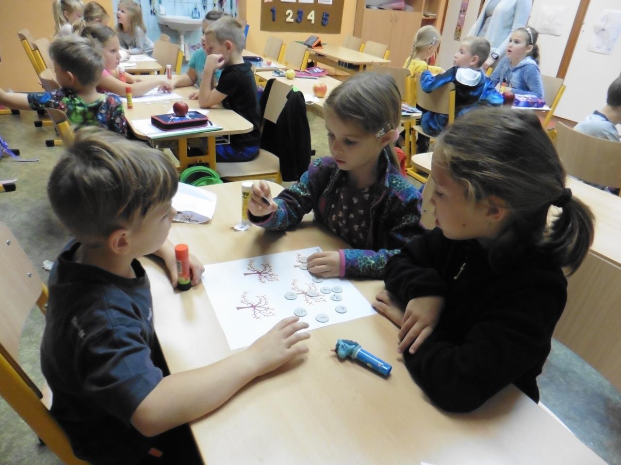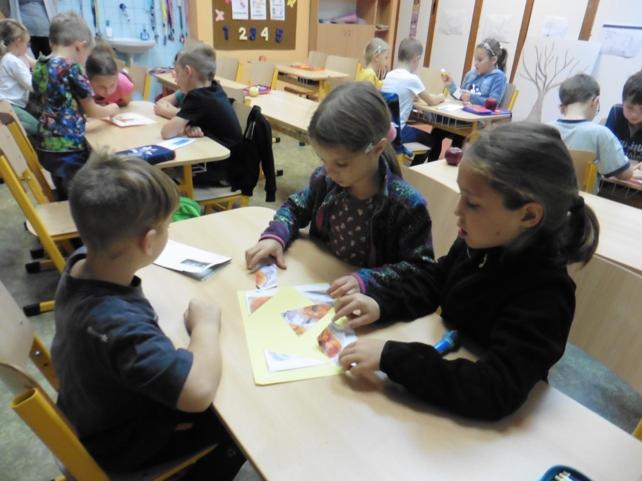 Četli, počítali, vyhledávali tvary písmen na písmenkové jabloně, spolupracovali při skládání obrázků, tvořili a zavařovali, ochutnávali :-), poslouchali pohádku, zpívali s doprovodným pohybem, hodnotili.
