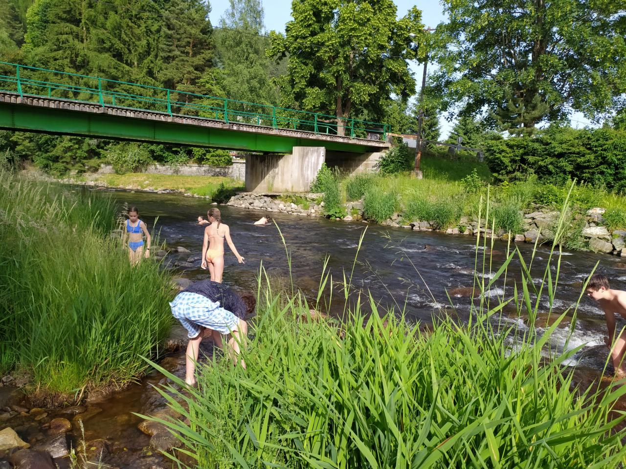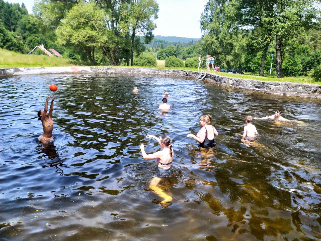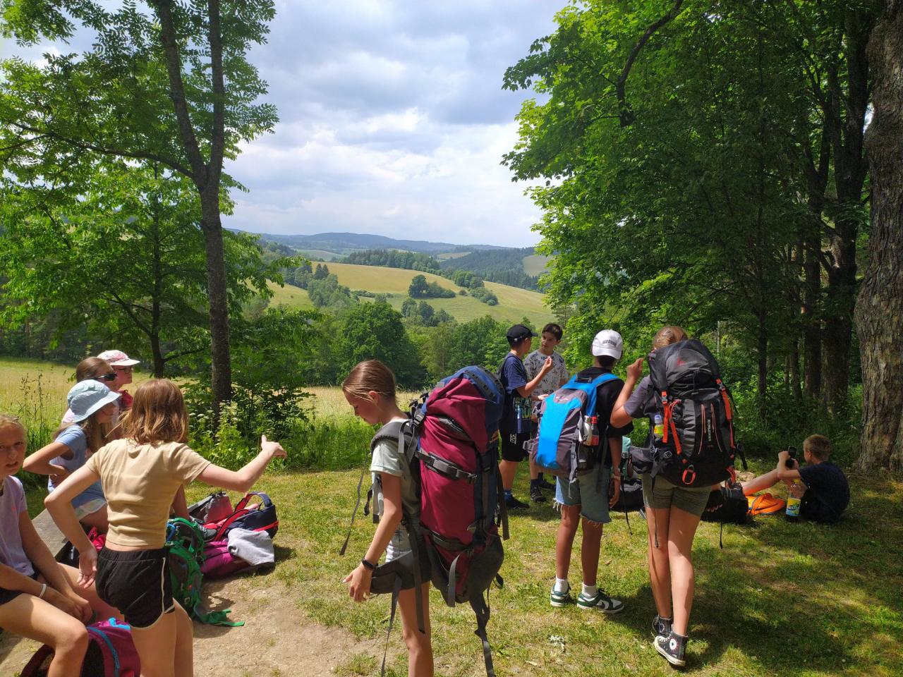 koupání Annín, pěšky s batohy a bouřkou do kempu, večerní vystoupení skupin, výlet na Kašperk, oheň...